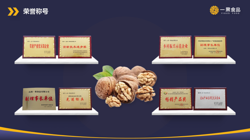 Shanxi Yiguo Food Co., Ltd. was established in June 2014, covering an area of more than 260 acres, with a factory area of 80000 square meters, a normal temperature warehouse of 30000 square meters, a cold storage of 5800 square meters, a raw fruit storage capacity of over 20000 tons, a registered capital of 20 million yuan, and a total investment of 500 million yuan. It is a modern agricultural industrialization enterprise that integrates walnut planting, processing, domestic and foreign trade, and food research and development. Its main business focuses on the cultivation of walnut bases and the development, production, and sales of walnut series products. As a landmark project in Lvliang City aimed at expanding the walnut industry chain and enhancing the strength of the walnut industry, Yiguo Food has been recognized as a provincial key project in Shanxi Province and has been awarded the title of leading agricultural product processing enterprise in Shanxi Province.